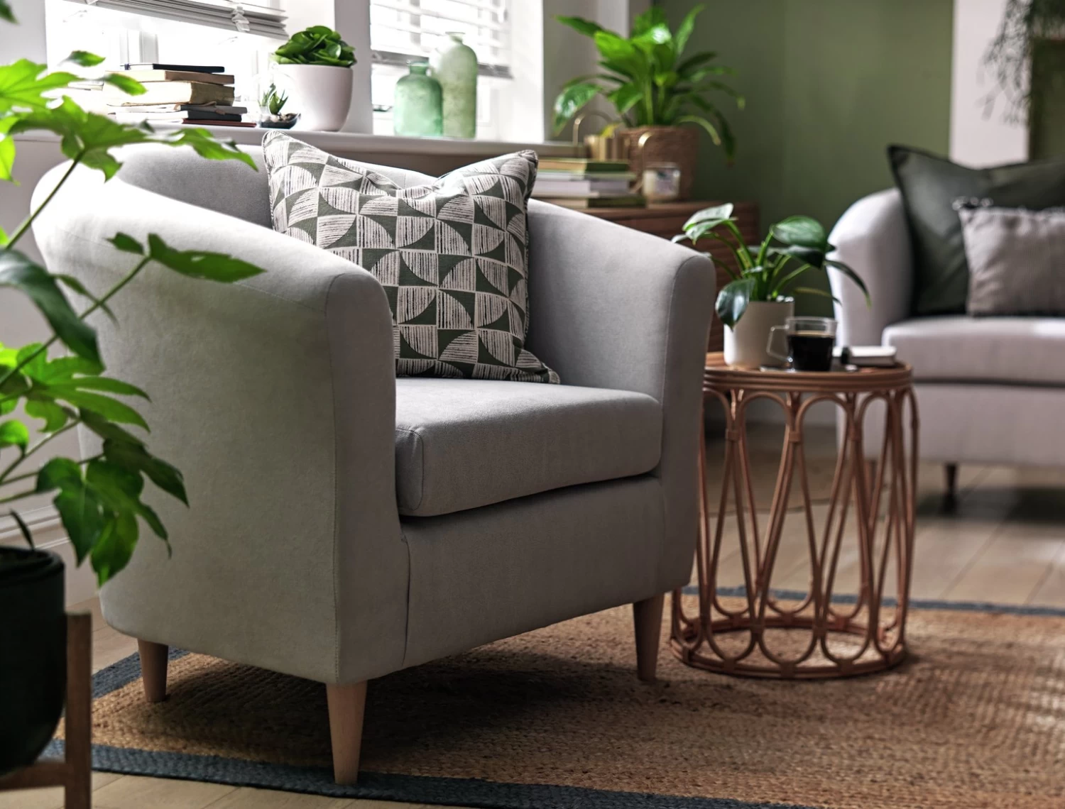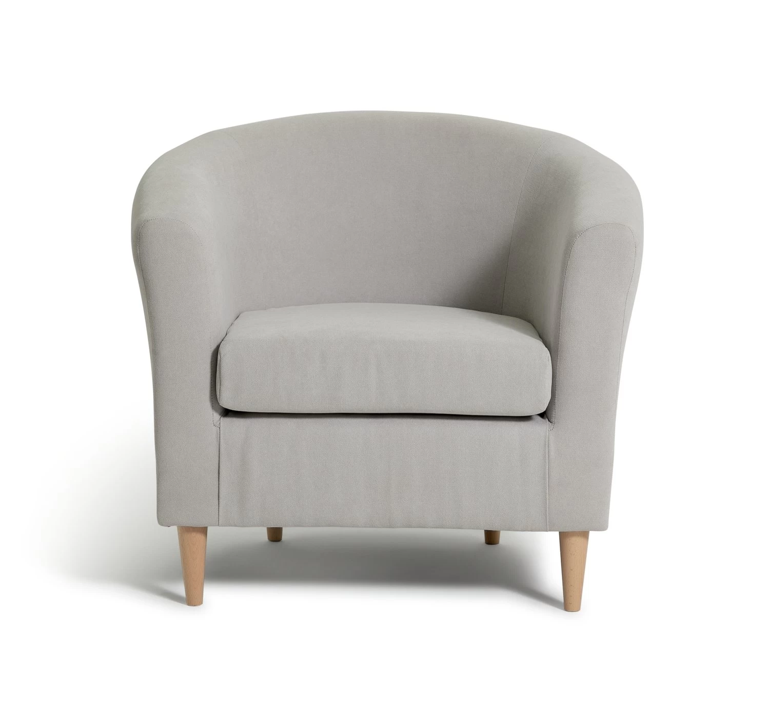 Sink into our neutral toned tub chair. Soft, rounded edges welcome you like a big hug. With a curvy frame and a foam-filled cushionit's made to curl up on. And those tapered wooden feet give this shapely seat a modern edge. Make it your own with colourful cushions. Grab a book and a cuppa, you're sorted.